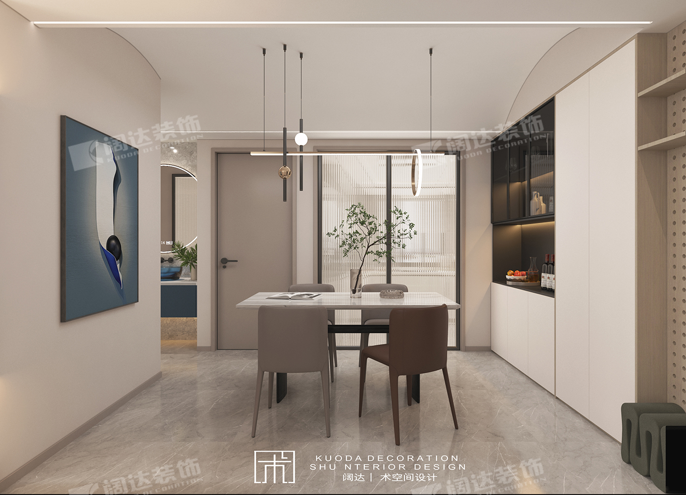 綜合以上調整結合業主需求,設計師又將陽臺墻體拆除換成移門,整體基調簡約為主,餐廳采用弧形頂設計,輔以線性燈照明,既適當放大層高,又烘托了就餐氛圍。